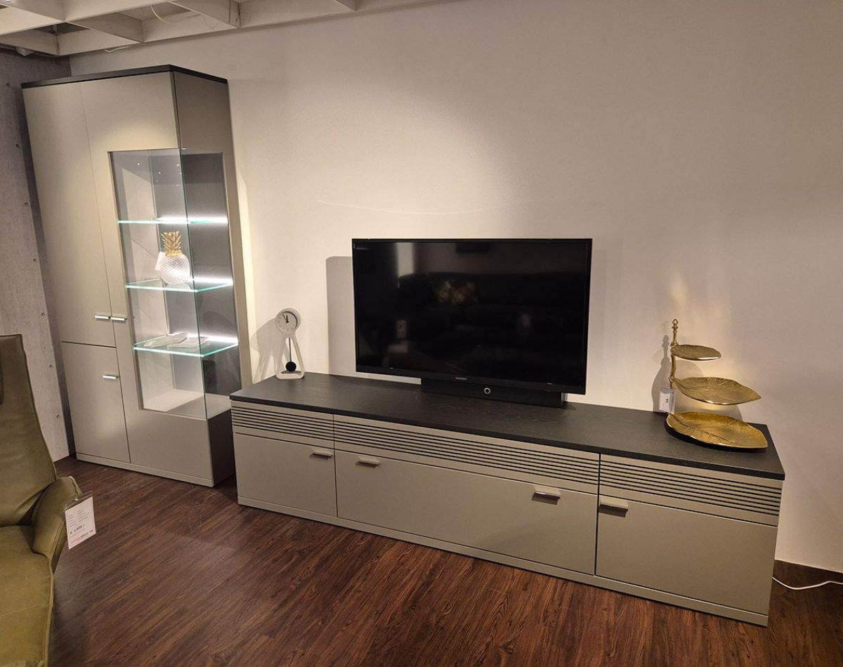 - Wohnwand bestehend aus: Vitrine inkl. Beleuchtung, TV-Board inkl. TV-Halterung mit Schwenkfunktion, und Akustikblenden