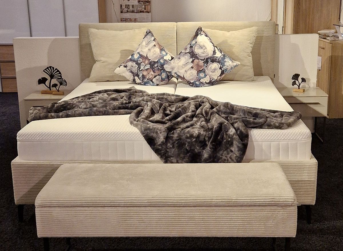 - Polsterbett ca. 180 x 200 cm inkl. Stauraum. Inkl. 2 x Lattenrost mit seitlicher Öffnung, Inkl. Kopf- und Fußteilverstellung, inkl. 2 x Matratze: Taschenfederkern mit Gelschaumabdeckung.